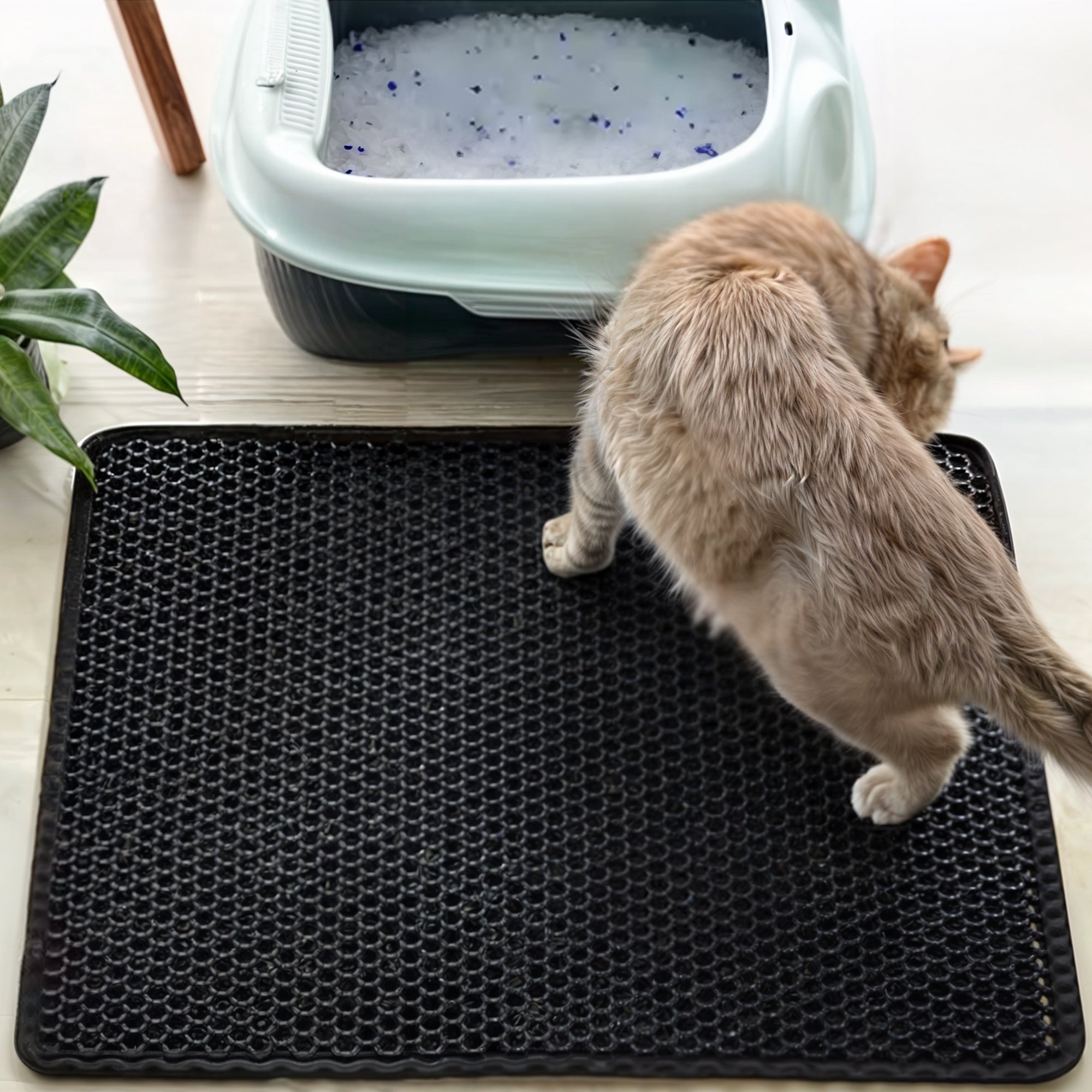 It features a double-layer design with a waterproof base layer, preventing water and urine from leaking onto your floor. The eco-friendly and high elastic EVA foam, with a honeycomb pattern, easily gathers litter from your cat's paws and the litter box, saving you both cleaning time and sand costs.